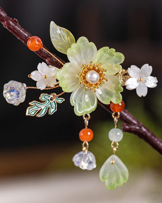 • Vintage Rainbow Copper Overgild Pearl Hawthorn Leaf Tassel A Pair Hairpin