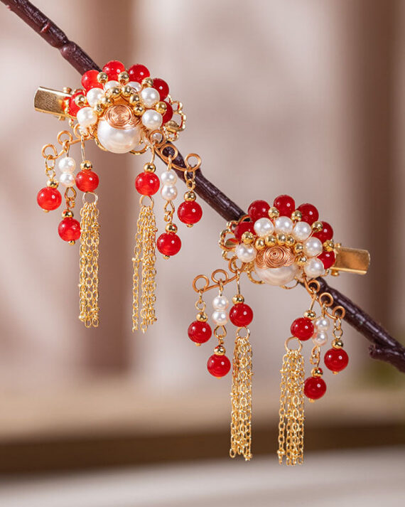 • Stylish Red Copper Alloy Pearl Female Martial Artist Role Tassel Hairpin
